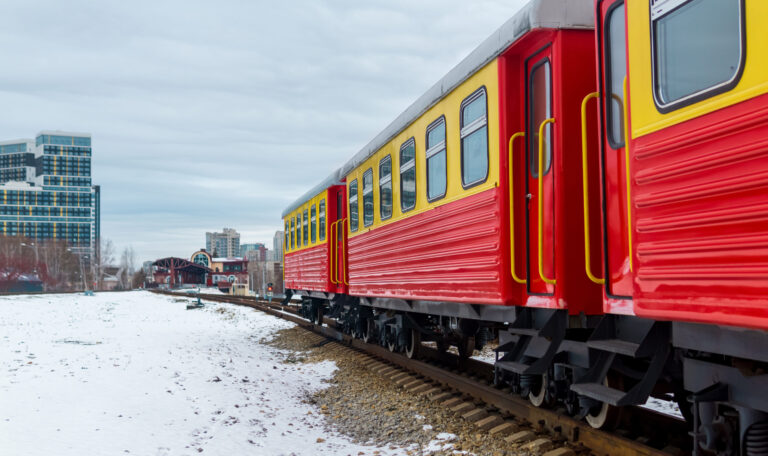 passenger train cars on a narrow gauge railway against the background of the city